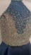 Stunning evening gown with a Navy blue satin skirt and studded with rhinestone embellished bodice. Perfect for formal occasions.