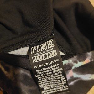 Workout leggings from Pink by Victoria Secret. Really cute style, black with patches of swirly tie dye. In great condition, except for one small tare on bottom of one of the legs (see picture).