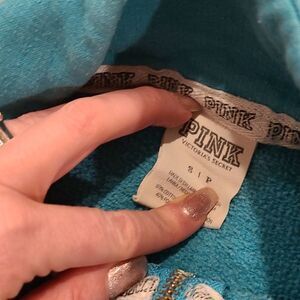 Pink by Victoria secret teal 3/4 zip size small, two small holes in arms of sweatshirt as shown in pictures