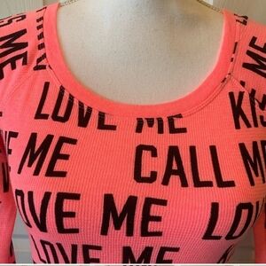 Stylish pink long sleeve waffle knit top featuring bold graphic text and scoop kneck. Perfect for a trendy, casual look. Excellent condition!