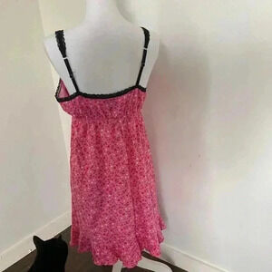 Pink cherry & heart print lace cami dress. Has padding and adjustable straps. Bow, lace and ruffle detailing.