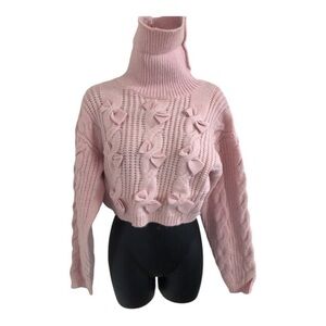 Pink chunky cable knit pink bow crop turtleneck long sleeve sweater size large