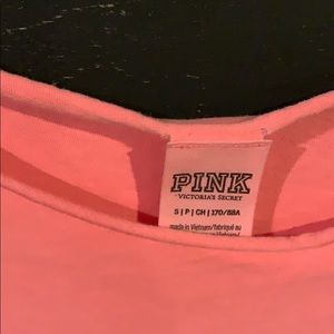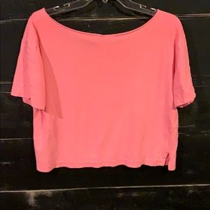 Pink crop top. Wide bottom for comfort. There’s a little tiny spot on the front near the chest area. Please look at picture