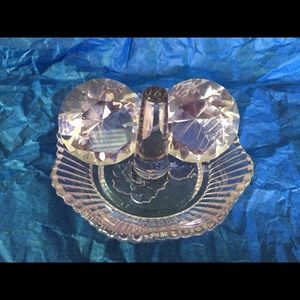 Large pink diamonds and a pink ring holder to match. Hard to tell in picture but color of all three are light pink and match. Super cute to decorate with. Or to give as a gift!