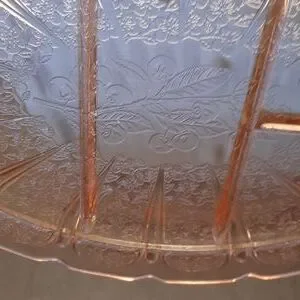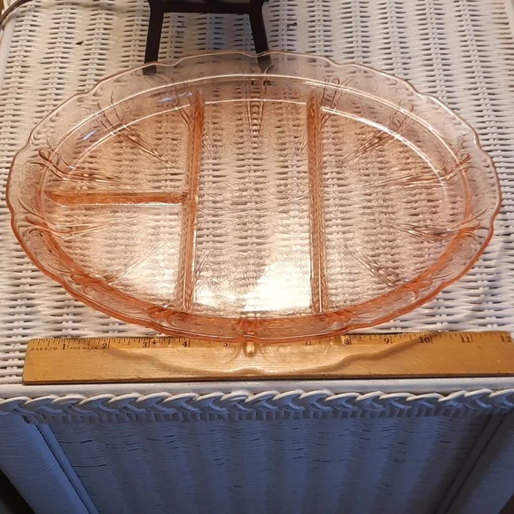 Vintage depression glass Jeannette Cherry Blossom Pink divided platter. Last picture shows scratch in middle section of plate.