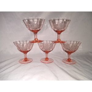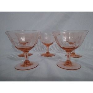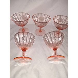 Pink depression glass sherbet flower etched stemware glasses (set of 5)