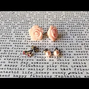 This pink rose earrings set consists of a medium pastel pink resin flower (6mm), pink faux pearl earring studs, lastly, Pink gemstone studs