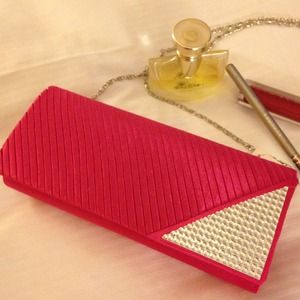 Pleated pink satin front embellished with sparkly corner. Silver tone shoulder strap can be tucked into the purse to use as a clutch. Brand new with tags