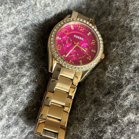Excellent used condition. Pink face with jewel surround Fossil watch. Needs battery gorgeous