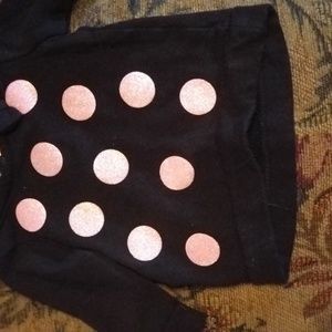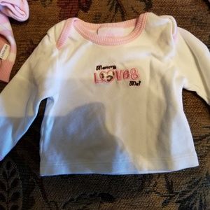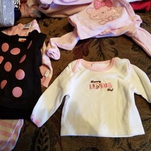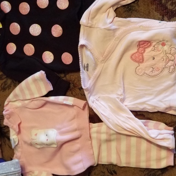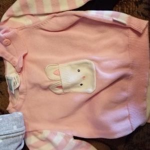 White & Pink bunny sweater with matching pants, Pink long sleeve baby bear top could match pants, I love Mommy top that could match pants, black sweater with sparkling pink dots.