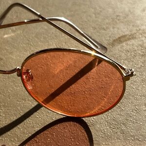 Pink tinted fashion glasses, gold frame, minimal scratches