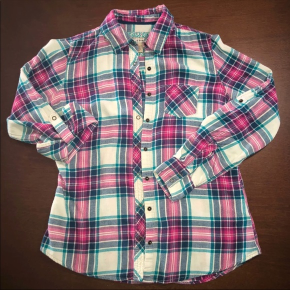 Pink and blue/turquoise/teal and white plaid flannel or button-up/button-down made by Arizona jean company. Size medium. The buttons snap. If you’re interested in bundling with anything else on my profile please let me know and I’ll be happy to give you a great deal :)