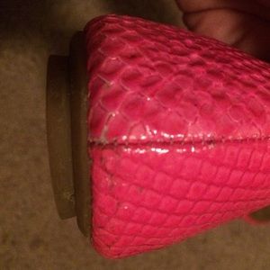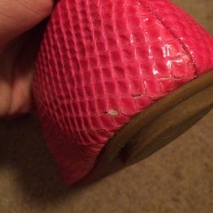 Shiny pink flats worn but still in good condition. See pictures for back of shoe wear.