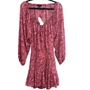 This vibrant red pink sundress from Forever 21 features a ruffled wrap design with a tiered skirt, perfect for casual or resort wear. The long bishop sleeves and scoop neckline add a touch of elegance, making it a versatile choice for any relaxed occasion.