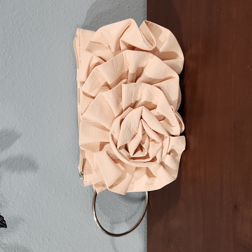 pink faux leather clutch, 9" wide, single pocket, silver ring handle, good condition!