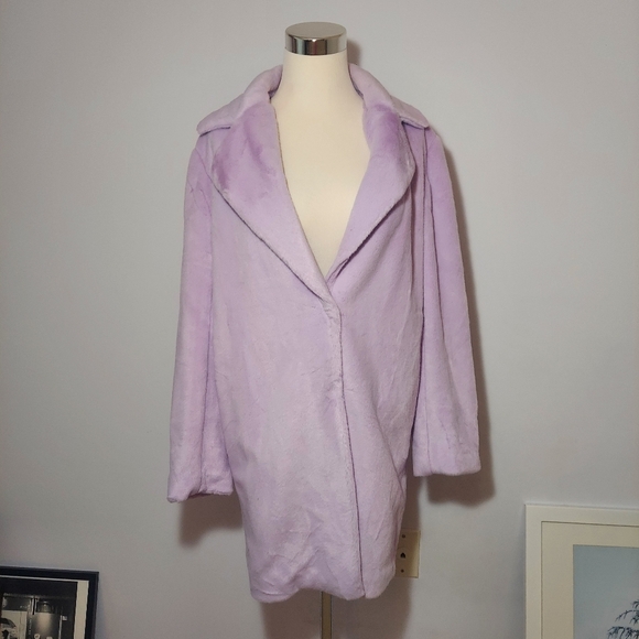 Pink lilac faux fur mid length jacket very comfy & warm lined inside. label says eggie