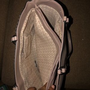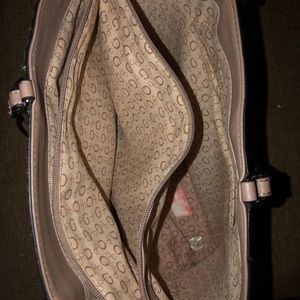A pink guess bag you can fit books in here i used it for school before also the only flaw is a little rip at the bottom of bag as shown