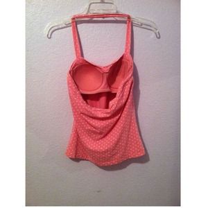 Pink halter top with white polka dots and padded cups. Fits medium-large.