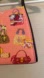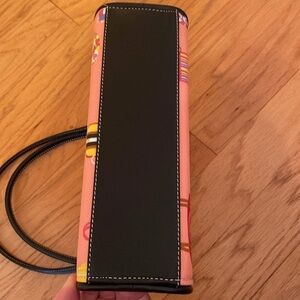 This small fun whimsical handbag is decorated with purses on a pink bag ground. Black handles, black interior with one zipper pocket plus an elasticated pocket. Zipper closure