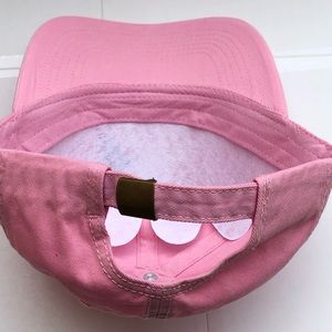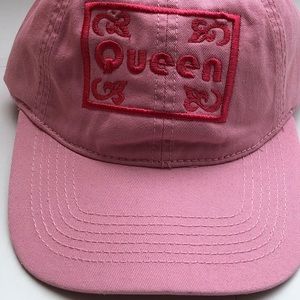 Pink cotton hat with hot pink “queen” embroidered on the front, surrounded by decorative detail.