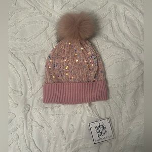 This pink hat features sequins, velvet, and a pom pom. Was given to me as a gift and never worn. Has original tags attached.
