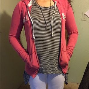 pink jacket, missing the zipper and has a few barely noticeable stains. true to size small
