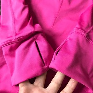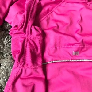 Picture makes it look like bright pink, it’s not as bright in person. In excellent condition. Thumb holes on sleeve and back vent for comfort. No pilling under armpit, hem or inner sleeve.