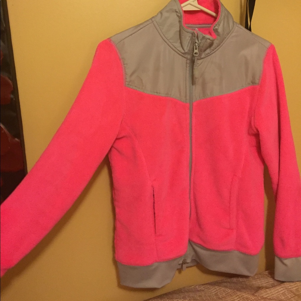 Bright pink and grey jacket. Very warm and comfortable.
