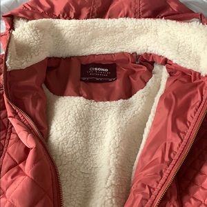 Worn twice. Pockets in front. Warm fuzzy inside. Hooded, comes up above waist.