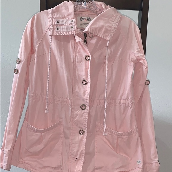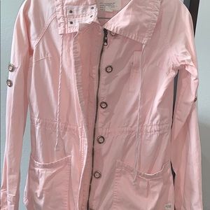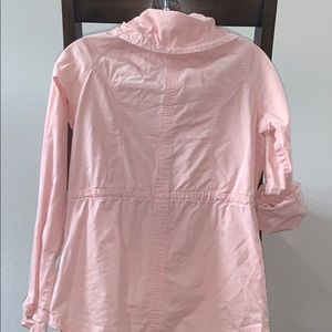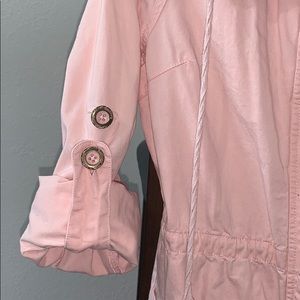This cute pink jacket is gently used, good condition. The buttons do have signs of wear ( see pic). It has a front zipper and front buttons for closure. And the the sleeves are adjustable. There is two front pockets and one upper side pocket.