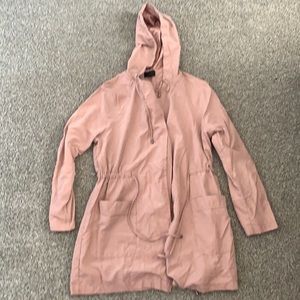 Pink jacket no zipper with hoodie has strings to tie up light weight