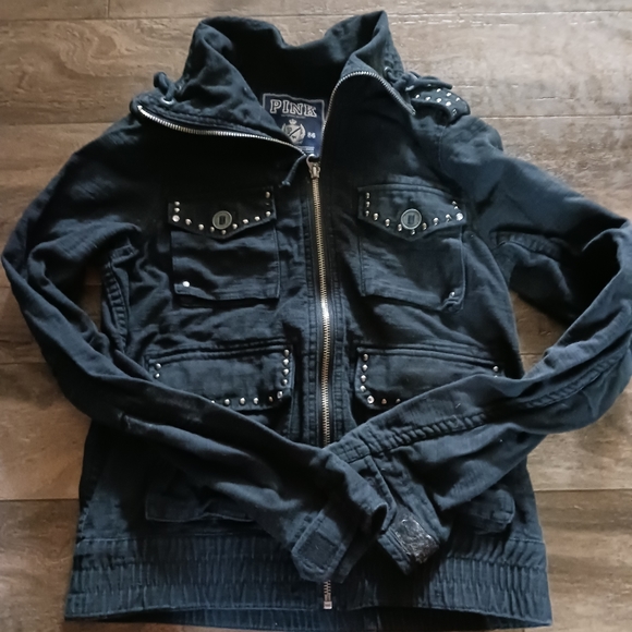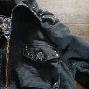 this is a cute jacket pics don't do it justice size small it's got weight to it no flaws found