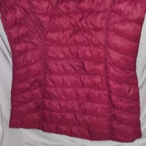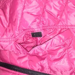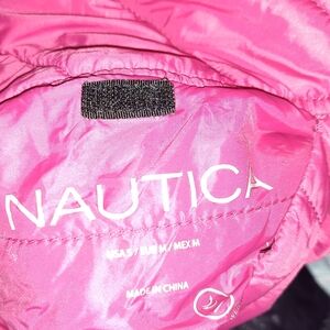 Reversible pink and black 1983 Nautica thin puffer jacket with hood. small hole on pink side(see picture with dime next to hole for comparison) both sides have Velcro pockets. zips to neck. hood is NOT REMOVABLE. SMALL