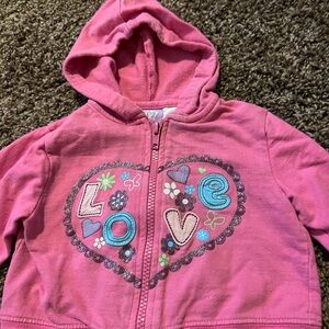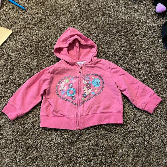 Pink zip up jacket with cute design on the front that says love in a size 12 months from the brand just max!