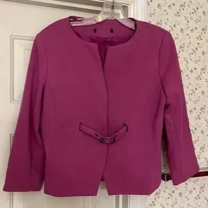Pink jacket. Collarless with press stud fasteners and belt. Material 69% Rayon 27% nylon 4% Spandex. Designer label missing