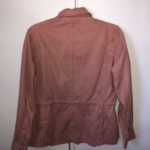 Pink jacket with zipper, buttons and many pockets. Also it cinches at the waist.