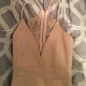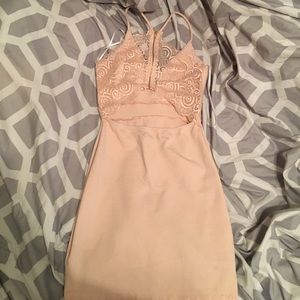 V cut pink dress , the dress is little bit stretchy but it's very short . Lace back with a zip going half up .