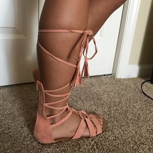 light pink "gladiator" sandals. Ties up the calf or can be tied around above the ankle. The laces have fringe tassels at the end. Super cute and comfortable. Only worn a couple times!