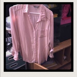 It is a thin denim pink material. One front pocket and buttons all the way down