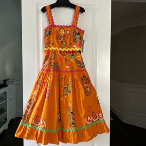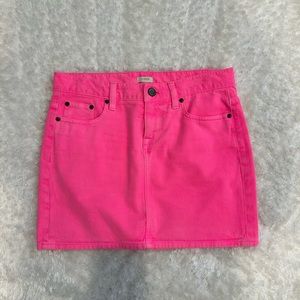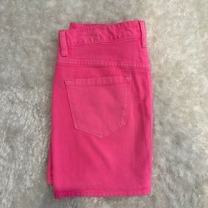 Denim material in bubble gum pink, zip-up front, back pockets like jeans. Super cute, mint condition