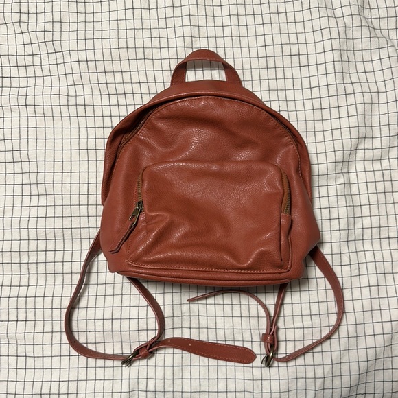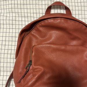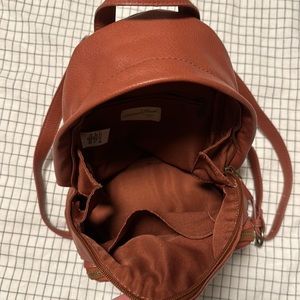 Non-leather, pink/clay color small backpack. About 10 inches tall. One outside zipper pocket in addition to the larger main pocket. Two organizing pockets on inside.