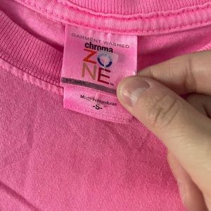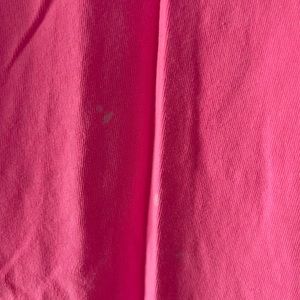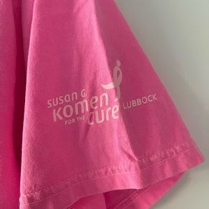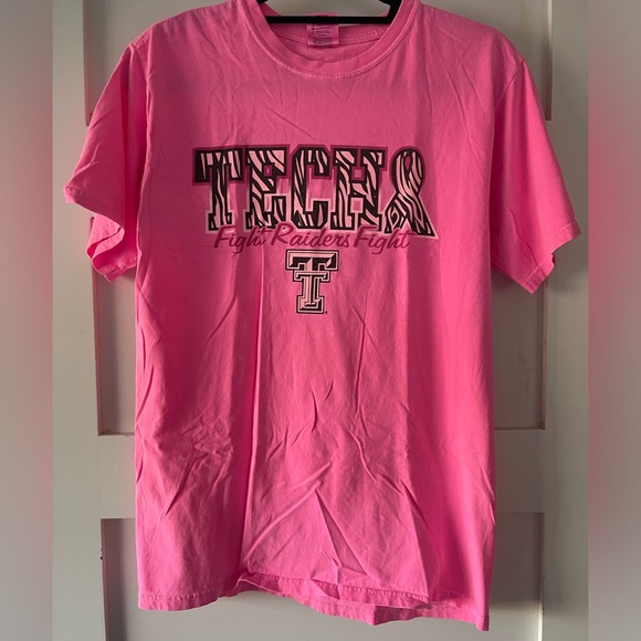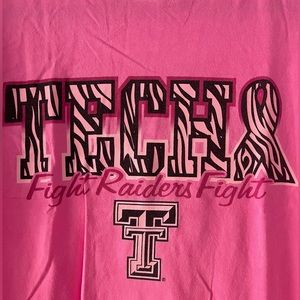 Bright pink Texas tech shirt. Susan g coman sponsor logo on sleeve for pink out. Zebra details in text. Couple small bleach stains, pictured.