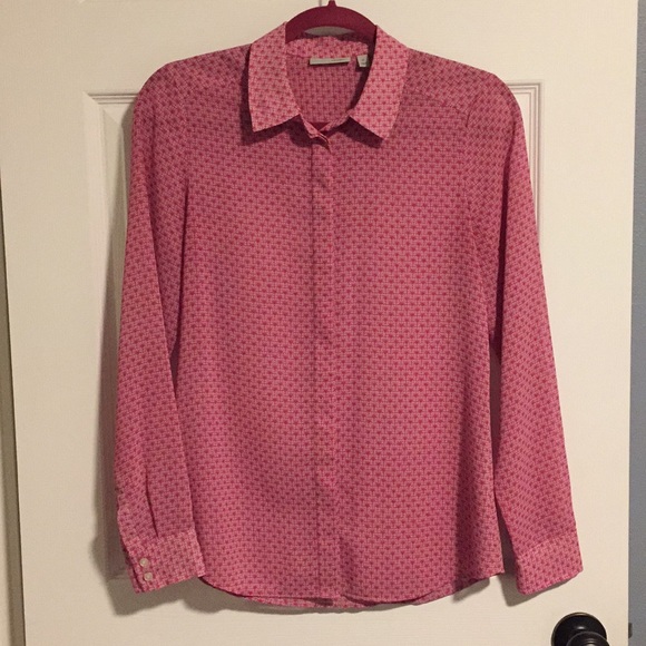 Sheer polyester Halogen blouse with pink sunburst pattern. Hidden buttons, see photo. Long sleeve. Worn only a few times and well taken care of, never tumbled dry.