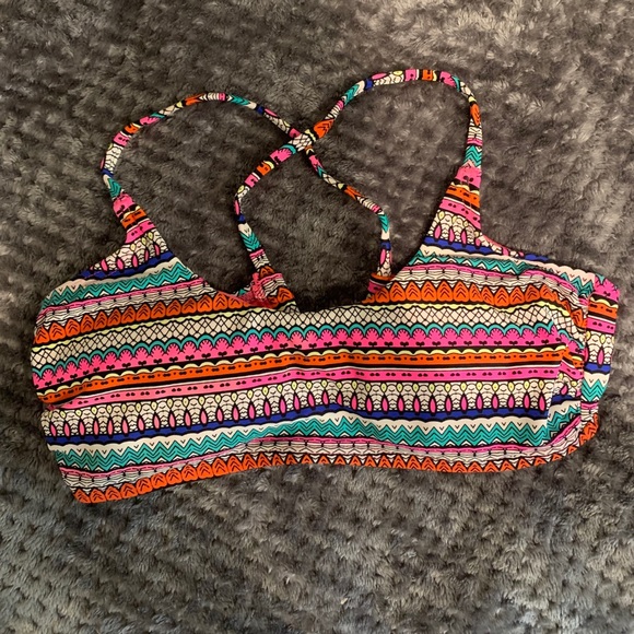 a multicolored and patterned (mainly pink) bikini top with a cross cross tie in the back with pads