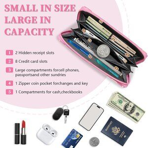 Features: Made with durable PVC exterior and soft polyester lining, this wristlet offers a tactile, wipe-clean surface with premium stitching and corrosion-proof accents. It features 8 card slots, a zippered coin pocket, 2 long compartments for bills and receipts, and 2 large slots for your phone or small essentials. The stylish pink-and-white checkerboard pattern is complemented by a luxe gold zipper and a detachable wrist strap — perfect for on-the-go safety and style.