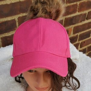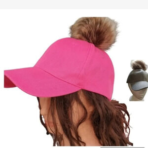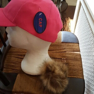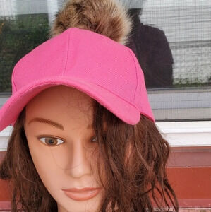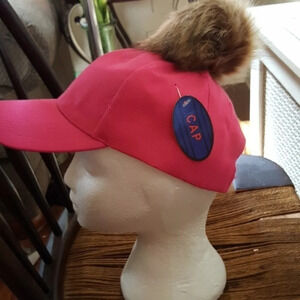 Great pink cap new from vendor with velcro adjustable back and removable pom pom in faux fur.