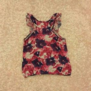 This is a floral print top with ruffles around the neck line. It has elastic around the waist. Size S.