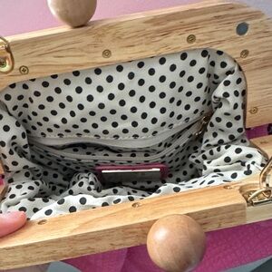 Elegant fuchsia clutch with a natural wooden frame. Features a delicate chain strap. Ideal for a stylish touch.
