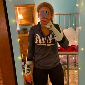 This sweatshirt is perfect for working out or just casually wearing around the house. No signs of wear or tears, only worn twice. Colors are teal, gray, white, and black.