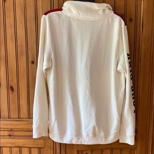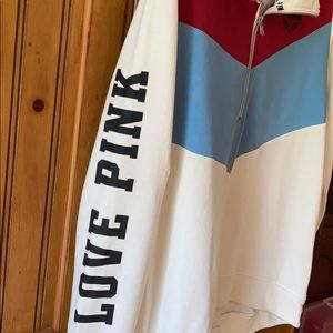 Size M, a white with blue/red pullover by Pink. Picture shows slight marking on left sleeve. Bundle with any other items for a discounted offer!💖